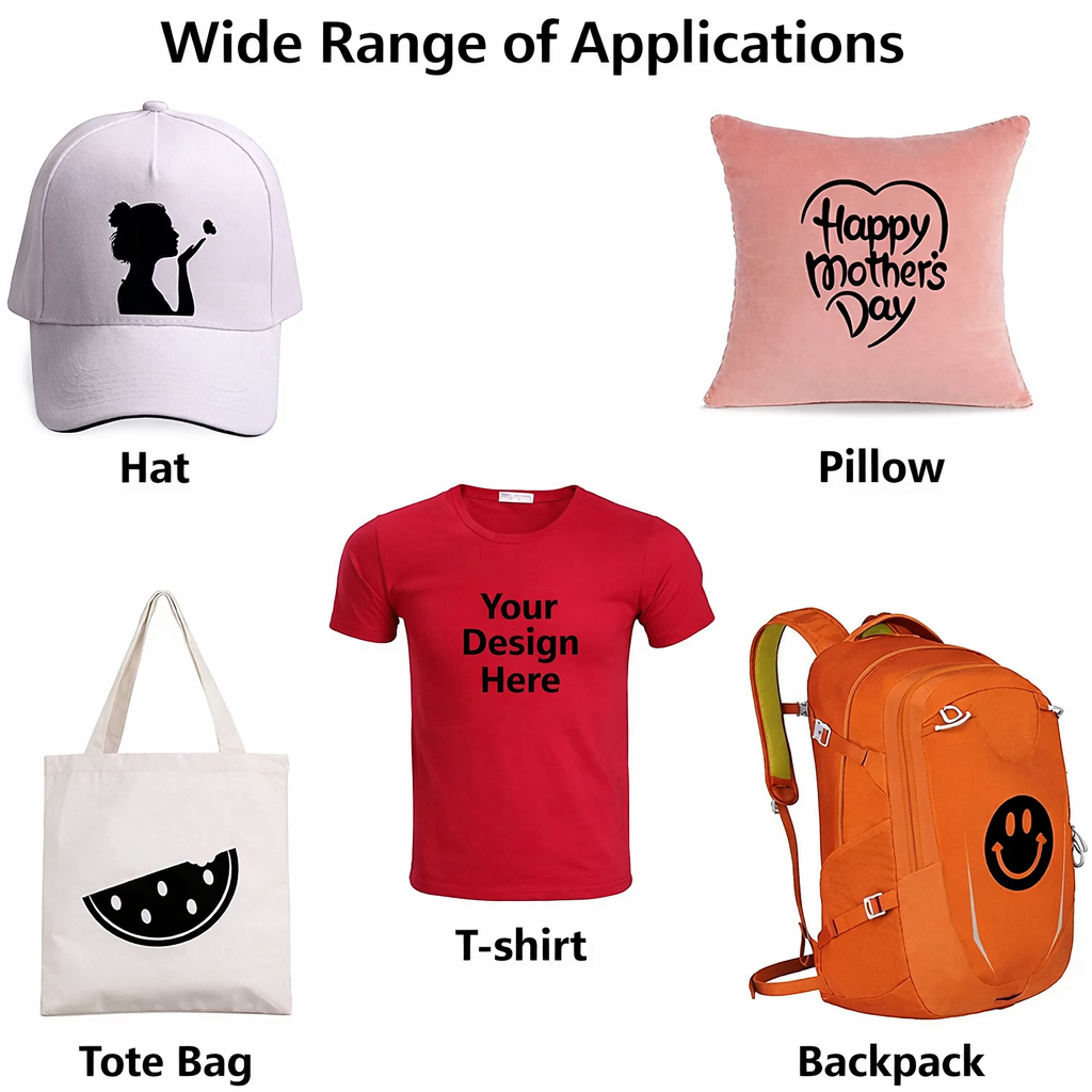 Geeignet für Baumwolle, Polyester, Baumwoll-Polyester-Mischgewebe, Lycra sowie Mesh-Stoffe. Nicht empfohlen für Nylon, Leder oder stark hitzeempfindliche Materialien.